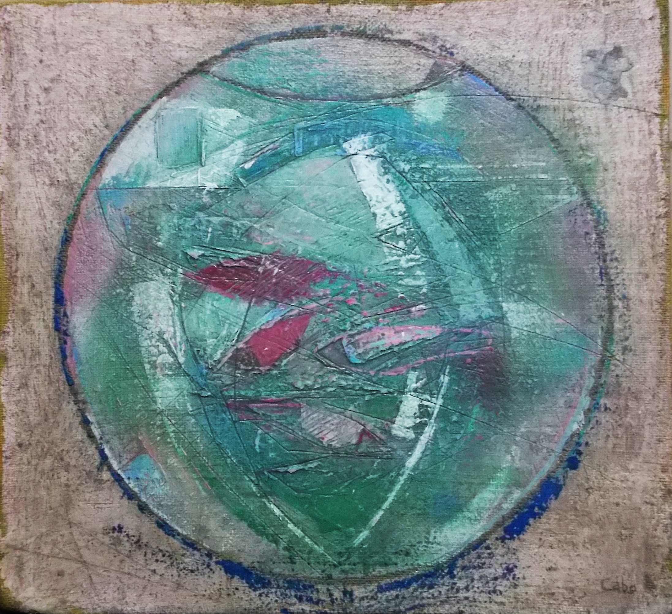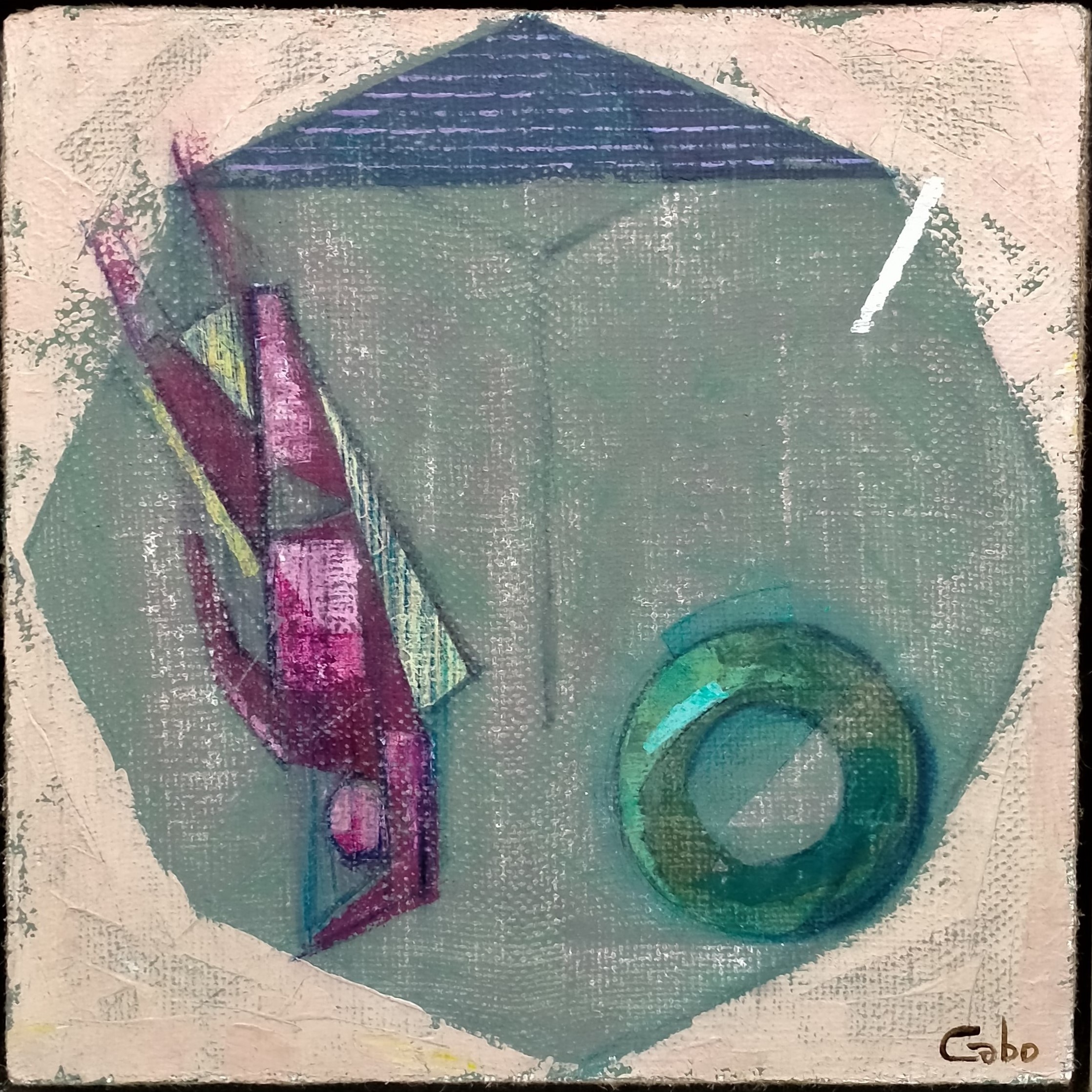 La obra de Javier Cabo ha estado marcada por las corrientes renovadoras de comienzos del siglo XX. Cubismo, futurismo italiano o surrealismo han dejado poso en su pintura que ha ido evolucionando con firmeza dentro de estos cauces. Ha concebido su trabajo como el de un artista comprometido con la reflexión y el pensamiento, cuestión que se demuestra en su afán por el estudio riguroso de la forma y la tendencia al análisis de estructuras. Las calidades plásticas son más que manifiestas: volúmenes creados con espátula, lijados e incisiones se equilibran con suaves transparencias en blancos y azules que proporcionan luces sorprendentes en un conjunto fuertemente contrastado. Figuras construidas a partir de planos, pesadas en su hieratismo, casi escultóricas, recuerdan las monumentalidades del mejor muralismo y parecen rescatadas de un pasado remoto.